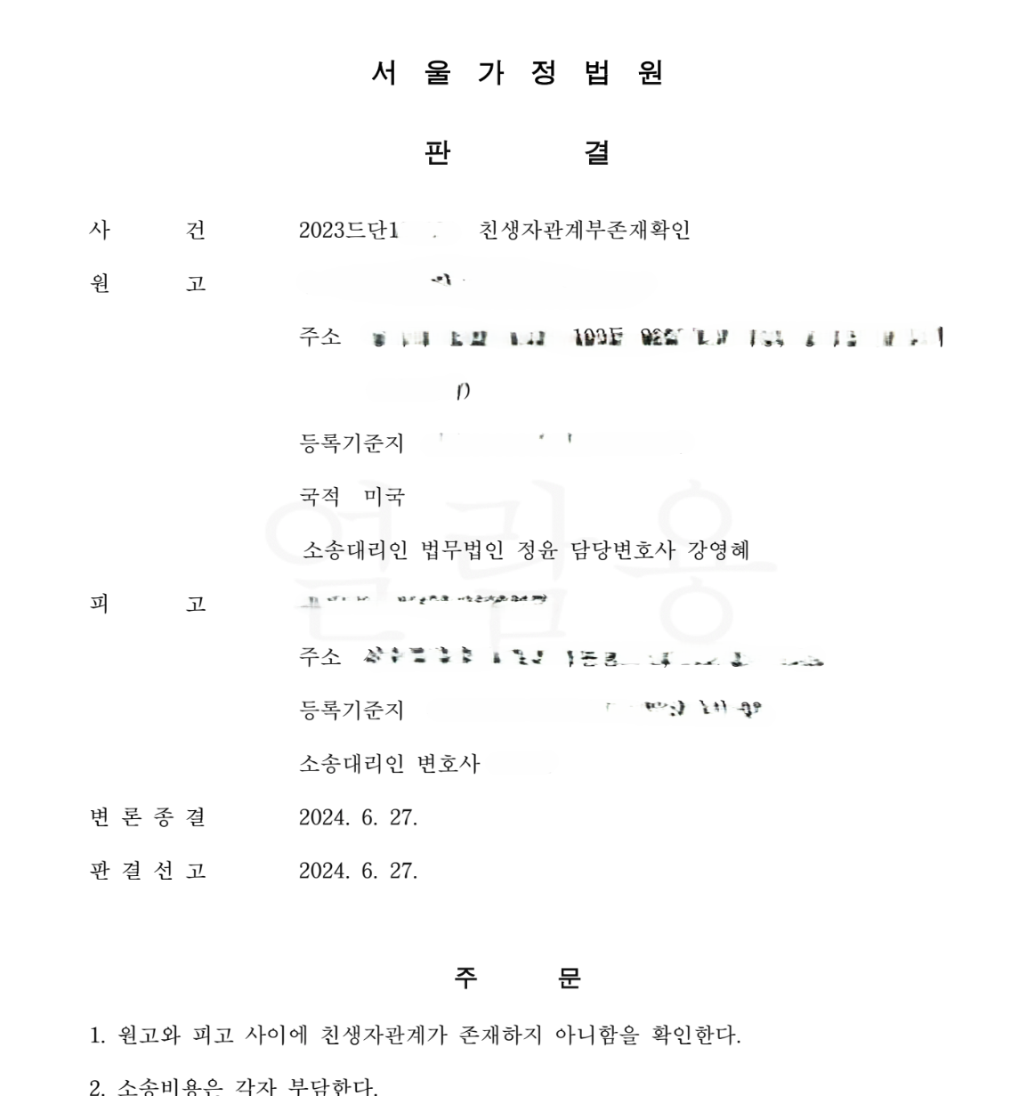 이 사건은 소장을 제출한지 거의 1년 만에 두 사람 사이에는 친생자관계가 존재하지 않는다는 판결을 받았습니다.